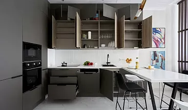 Самыми удобными считаются модульные кухонные гарнитуры, изготовленные на заказ. Когда можно индивидуально определиться с размерами и количеством шкафов, их формой и наполнением. С помощью модульной кухни можно визуально разделить просторное помещение на несколько зон. Для этого подходят модели с барными стойками и островами.