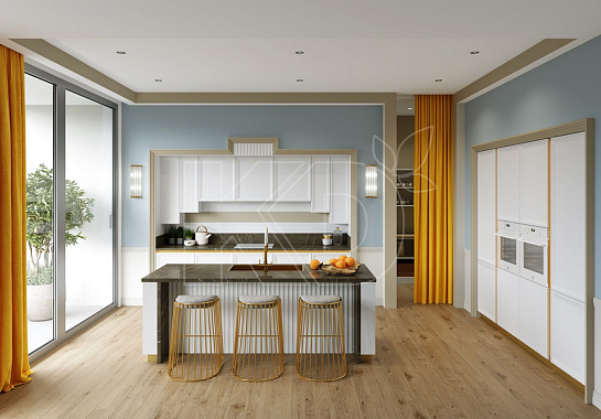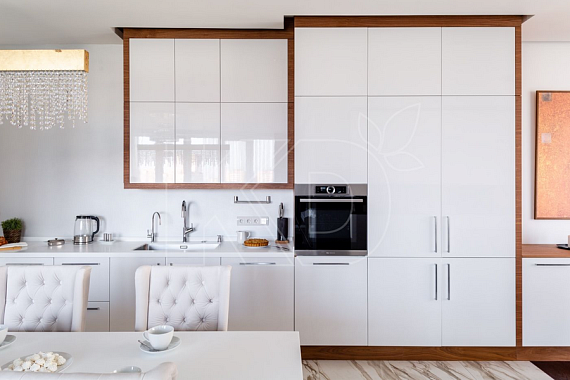 Чистота, воздушность и нежность – вот какие слова возникают при взгляде на просторную белую кухню в современном стиле. Помещение наполнено светом, легкостью и самыми мягкими тонами. Здесь нет темных красок, исключительно белые тона.