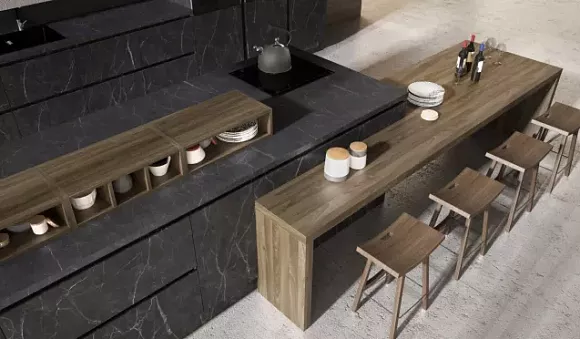 В кухонном углу устанавливают черную столешницу, которая способствует созданию дорогого, солидного и благородного интерьера. Для оформления красивого основания применяют каменную крошку, блестки или перламутровые вкрапления.