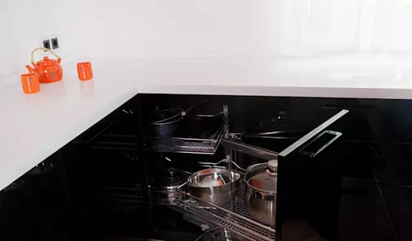 Кухни в черных тонах в стиле хай-тек нередко напоминают секретную лабораторию или космический корабль. В них приветствуют хромированные элементы. Лучше всего выбирать последние новинки в технике с сенсорными элементами управления.