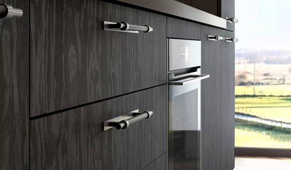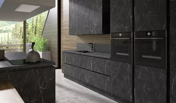 - Рекомендуется выбирать черную кухню в современном стиле. Лучше всего, если фасад будет прямоугольной формы со скрытыми элементами фурнитурами. В зависимости от пожеланий заказчика можно выбирать глянцевую или матовую поверхность.
