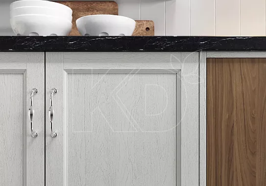 Светлые породы типа ясеня и беленого дуба в сочетании с белыми фасадами выглядят спокойно и невыразительно, но такое решение может подойти тем, кто хочет сделать стены или потолок максимально акцентными и добавить большое количество декора.