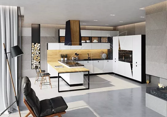 Белая глянцевая кухня с деревянной поверхностью обладает рядом преимуществ: