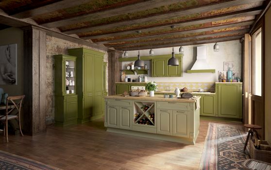 Цветовая гамма стиля кантри включает спокойные тона: коричневый, бежевый, светло-зеленый, белый. Фактура фасадов чаще матовая, очень редко встречаются модели с глянцевыми поверхностями.
