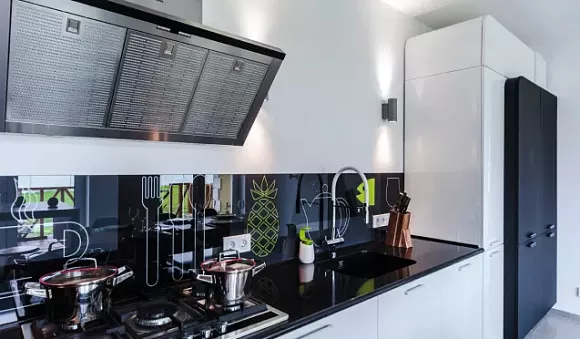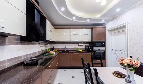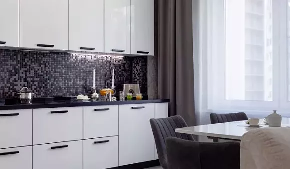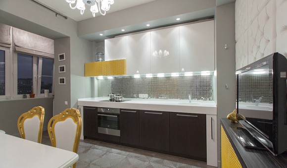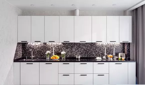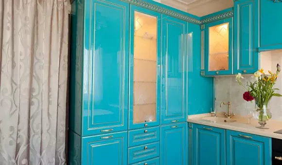 Чтобы глянцевая кухня идеально вписалась в помещение, обязательно учитывайте ее цвет. Так, для небольших комнат подойдут модели с белыми и бежевыми фасадами. Подобные версии не затеняют пространство. Наоборот, они зрительно расширяют его, особенно, если глухие дверцы разбавлены стеклянными.