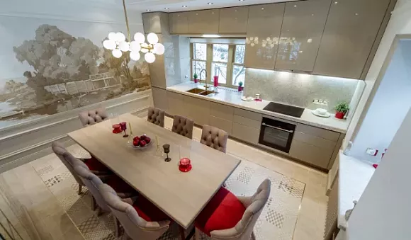 Также глянцевые модели подходят для неоклассических интерьеров. В этом случае при оформлении помещения применяется стекло, натуральное дерево и камень. Элементы из этих материалов подчеркивают красоту глянца.