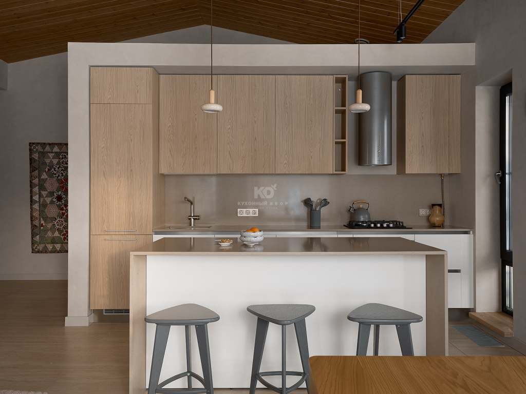 Интерьер не спорит с пейзажем за панорамными окнами, а становится его эхом. Когда за стеклом замирает лес, кухня превращается в мягкую раму для этой живой картины. Цветовая палитра — это диалог рассветных сумерек и пробуждающейся природы: молочные фасады, словно легкая дымка, растворяются в теплых фактурах светлого дерева.