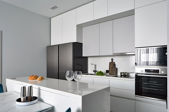 В таких проектах нет случайных зазоров или “мертвых зон”: каждый шкаф и модуль подбирается с точностью до миллиметра. Это особенно важно для встроенной техники — ведь её нужно встраивать точно и безопасно.