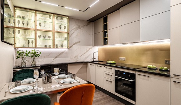 Чтобы маленькая светлая кухня радовала вас функциональностью и красотой, изготовьте мебель на заказ в бренда «Кухонный Двор». Специалисты предложат вам оптимальное решение, которое позволит сэкономить место.