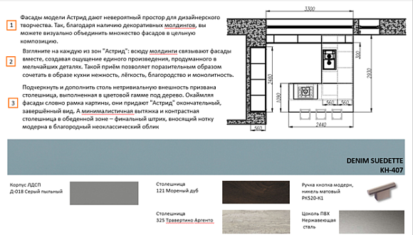 Внешний вид кухни классик модерн «Астрид» создан благодаря сочетанию всех элементов, от выбора материала до элементов декора. Благодаря тому, что выбраны пастельные тона, кухонный гарнитур зрительно увеличит любое помещение. Такой интерьер сделает уютным пребывание для всей семьи.