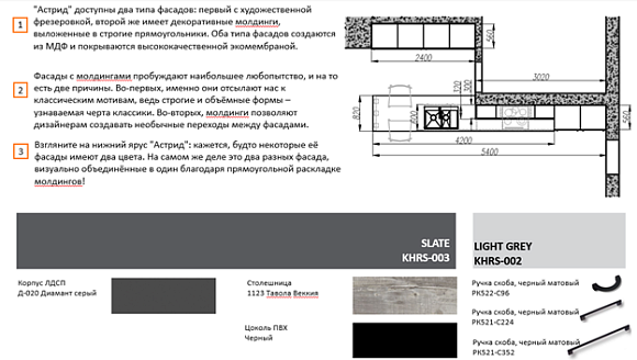Если Вы желаете заказать нестандартную кухню, оставляйте заявку. Прежде всего мы реализуем замер помещения, чтобы понять, как именно нужно оформить мебель по Вашему заказу. Наши монтажники люди профессиональные и понимающие, которые создают все самое лучшее для наших клиентов, поэтому можете быть уверены в том, что, если у Вас есть личные предпочтения, можете смело ими делиться. Мы создадим проект, который будет соответствовать Вашим личным требованиям. Сочетая в себе одновременно стили "Модерн" и "Классику", модель "Астрид" прекрасно впишется практически в любой интерьер!