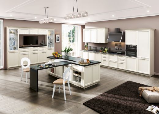 Классический стиль. Для декорирования используют исключительно светлые цвета и оттенки. Кухни классика отличаются плавными переходами, деревянными половыми покрытиями, роскошными шторами из тяжелых и дорогих тканей.