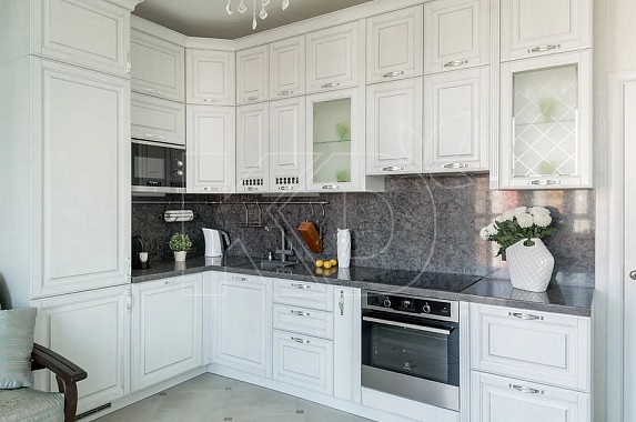 Г-образные гарнитуры состоят из модулей, расположенных вдоль перпендикулярных друг к другу стен и задействующих глухой угол. Современная фурнитура позволяет с легкостью использовать данное ранее труднодоступное пространство, освобождая дополнительные рабочие поверхности. Количество модулей подбирается индивидуально в зависимости от размеров кухни. Среди достоинств угловых мини кухонь, цена выступает лишь одним из плюсов. Также среди преимуществ можно отметить:
