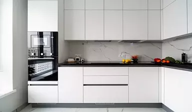 После завершения отделочных работ можно приступать к сборке и установке кухонной мебели. Выполнить это можно самостоятельно, но лучше всего обратиться к специалистам. Они быстро и правильно соберут комплект, интегрируют его в пространство, установят столешницу и мойку.