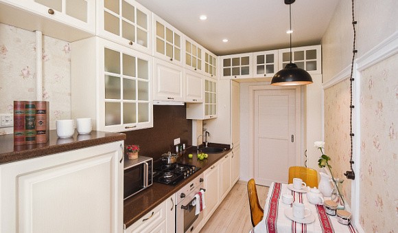 Более авангардные решения, в которых на фасадах мебельного гарнитура применяются вставки из натурального дерева или белые блоки – смотрятся более свежо в любой обстановке вне зависимости от степени освещенности. Они понравятся почитателям стилей прованс, эклектика и модерн.