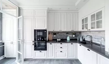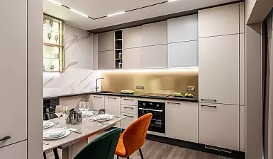Экоплита Egger в сборке кухонного гарнитура с ламинированием заготовок с обеих сторон – идеальное решение для небольшой кухни, которую хочется расширить.