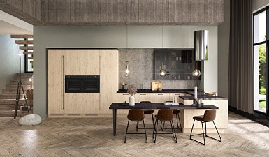 Самыми эффектными кухнями на 2023 год считаются модели с контрастным сочетанием блоков, выполненные из экологичных материалов в комплектации фасадов из МДФ и экомембраны со стилизацией под светлое и темное дерево.