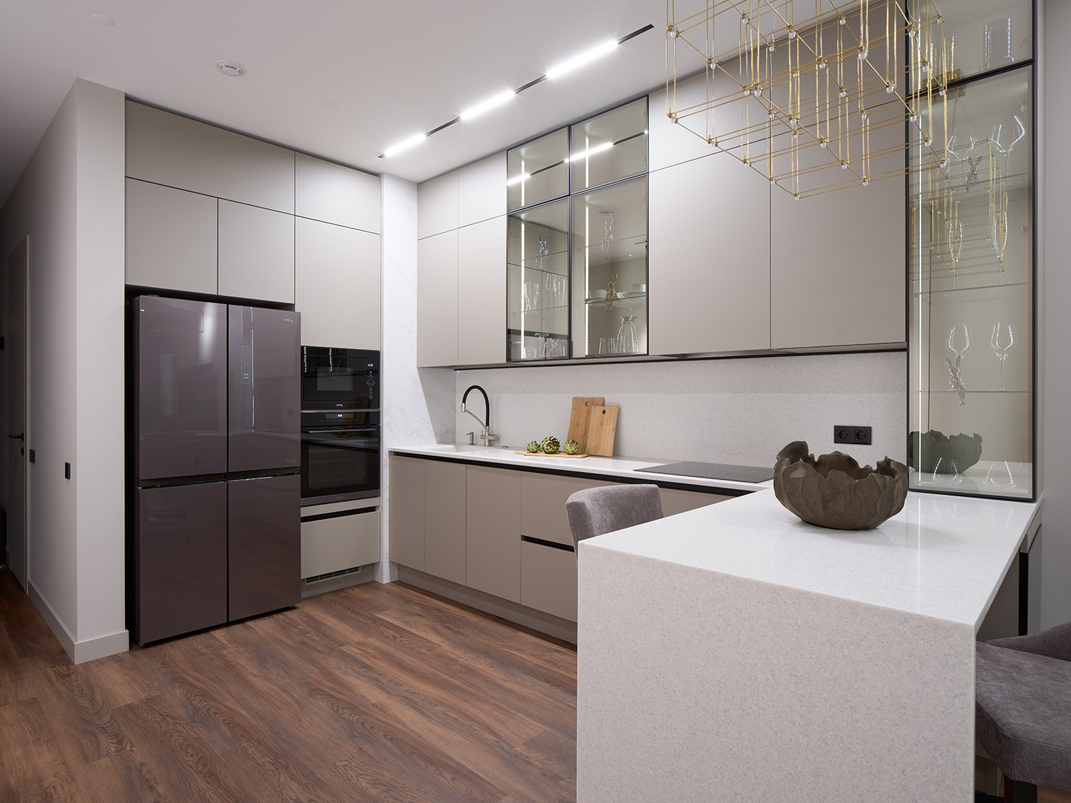 Столешница перетекает в барный стол — лаконичный, уверенный, рассчитанный на четыре посадочных места. Здесь можно неторопливо завтракать, работать за ноутбуком или собираться вечером с бокалом вина, устраивая камерные вечера для самых близких. И раз уж речь о вине — важным пожеланием заказчика было интегрировать винный шкаф. Его аккуратно встроили в торец кухни со стороны гостиной, чтобы он оставался на виду, но не перетягивал на себя внимание.