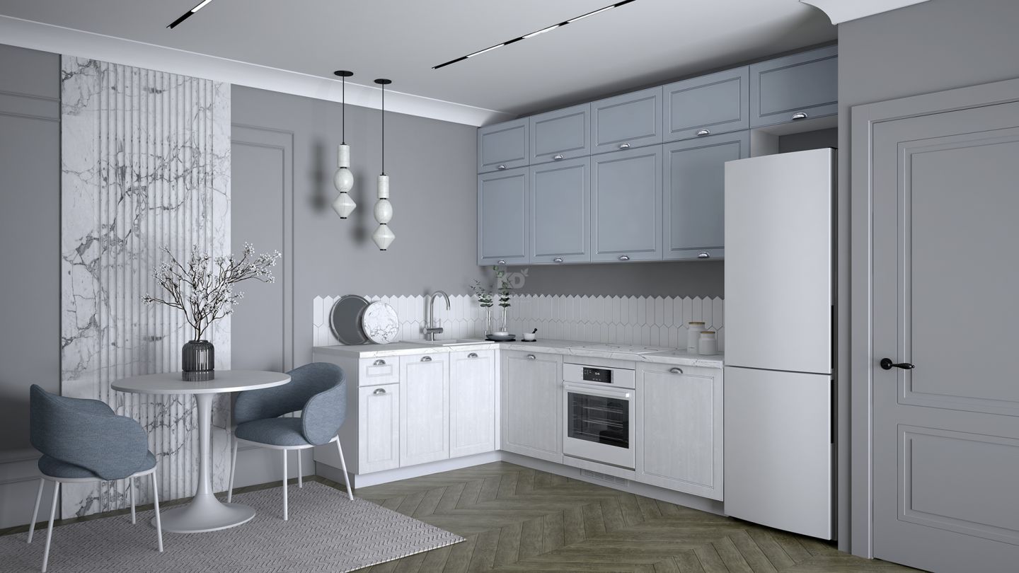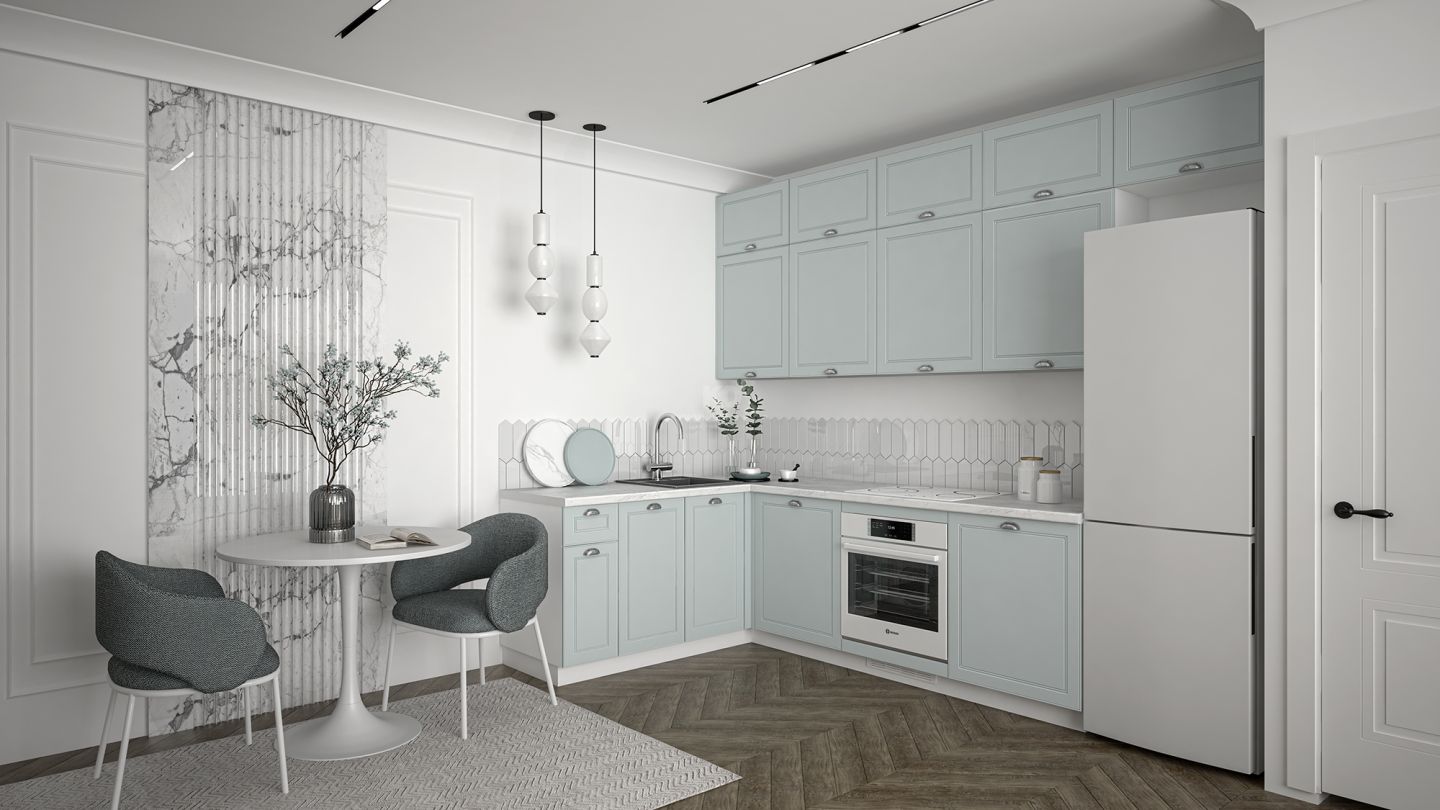 Глухие фасады с классическими рамочными линиями скрывают вместительные системы хранения: глубокие ящики, функциональные секции для посуды, бытовой техники и продуктов. Каждый элемент продуман таким образом, чтобы рабочие процессы были комфортными, а пространство использовалось максимально эффективно.